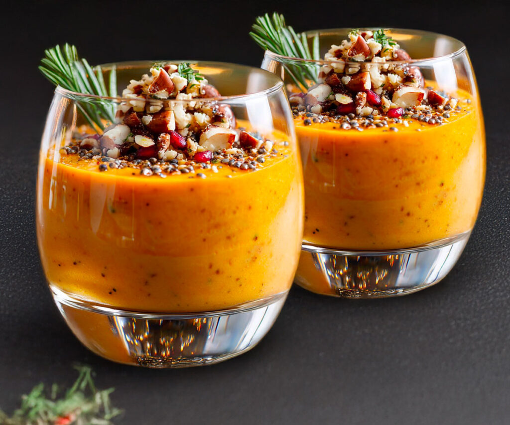Denne opskrift er så tiltalende takket være den delikate kombination af naturligt søde gulerødder og spidskommen, varme og duftende krydderier, der fremkalder festlige måltider og rejser. Moussens lette og cremede tekstur står i smuk kontrast til knasen af ristede hasselnødder. Alt serveres i klare glas, der fremhæver den smukke orange farve af tilberedningen.