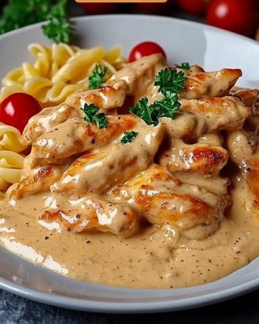Ingredienser: 400 g kyllingefilet, skåret i strimler 2 spsk olivenolie salt og peber efter smag 250 g pasta (f.eks. penne, tagliatelle eller fusilli) 1 løg, finthakket 2 fed hvidløg, presset 200 ml 30% fløde 100 ml kyllingebouillon 80 g revet parmesanost 1 tsk tørret oregano eller blandede italienske krydderurter frisk persille til drys (valgfrit) Instruktioner: