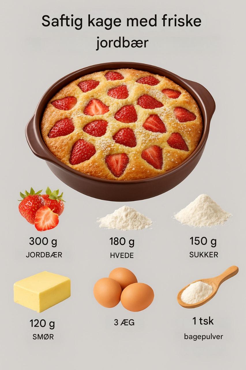 Ingredienser: 300 g friske jordbær 180 g hvedemel (type 450-500) 150 g sukker 120 g smør (smeltet og afkølet) 3 æg 1 tsk bagepulver en knivspids salt valgfrit: flormelis til at drysse med Tilberedning: