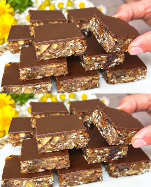 Ingredienser (til ca. 16 barer): 1,5 kop granola eller havregryn (f.eks. Sante, Kupiec) ½ kop hakkede nødder (valnødder, hasselnødder, mandler) ⅓ kop rosiner, tranebær eller hakkede dadler ¼ kop solsikke- eller græskarkerner ⅓ kop honning eller ahornsirup (valgfrit) 1-2 spsk jordnøddesmør (til topping) 100 g mørk eller mælkechokolade Tilberedning: