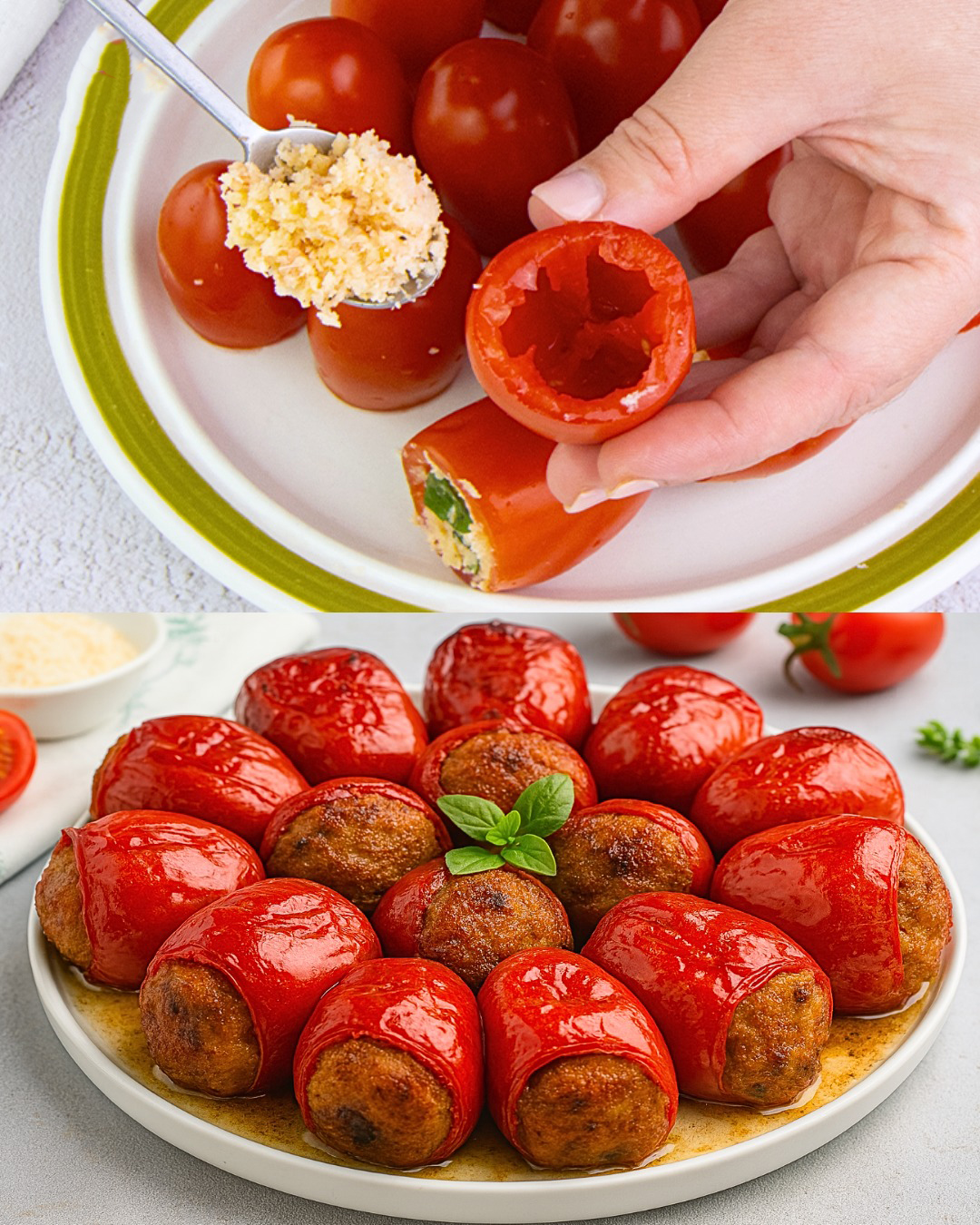 Ingredienser: 500 g små Piccadilly-tomater 70 g rasp 20 g friskrevet parmesanost 1 fed hvidløg, finthakket Frisk basilikum efter smag Salt og sort peber efter smag 80 ml vand 40 ml balsamicoeddike 1 spsk. brun farin (ca. 15 g) Olivenolie til at dryppe over Tilberedning: