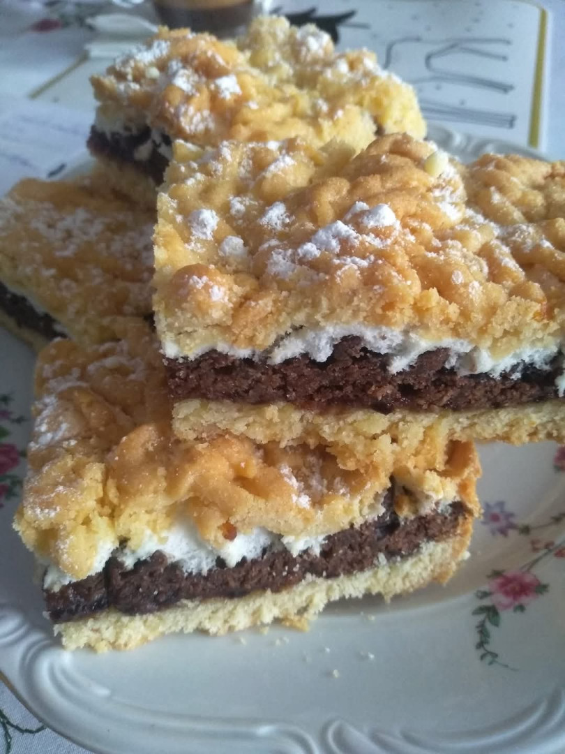 Ingredienser: 4 kopper mel 1 kop sukker 1 terning margarine 1/3 terning svinefedt 1 vaniljesukker 2 tsk bagepulver 4 æggeblommer (Pisk hviderne; de skal bruges til den mørke dej) 1 spiseskefuld flødeskum 1 glas marmelade (til at smøre) Instruktioner: Tilberedning af dejen: fortsættes på næste side