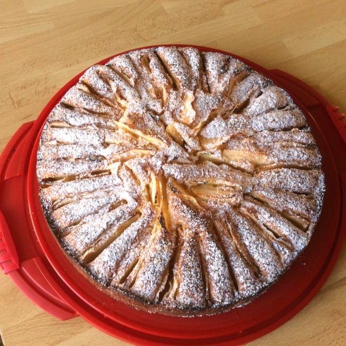 Ingredienser 3 æg 220 gram smør 150 gram flormelis 150 milliliter cremefraiche 250 gram hvedemel 2 teskefulde bagepulver 1 pakke vaniljesukker 5 æbler
