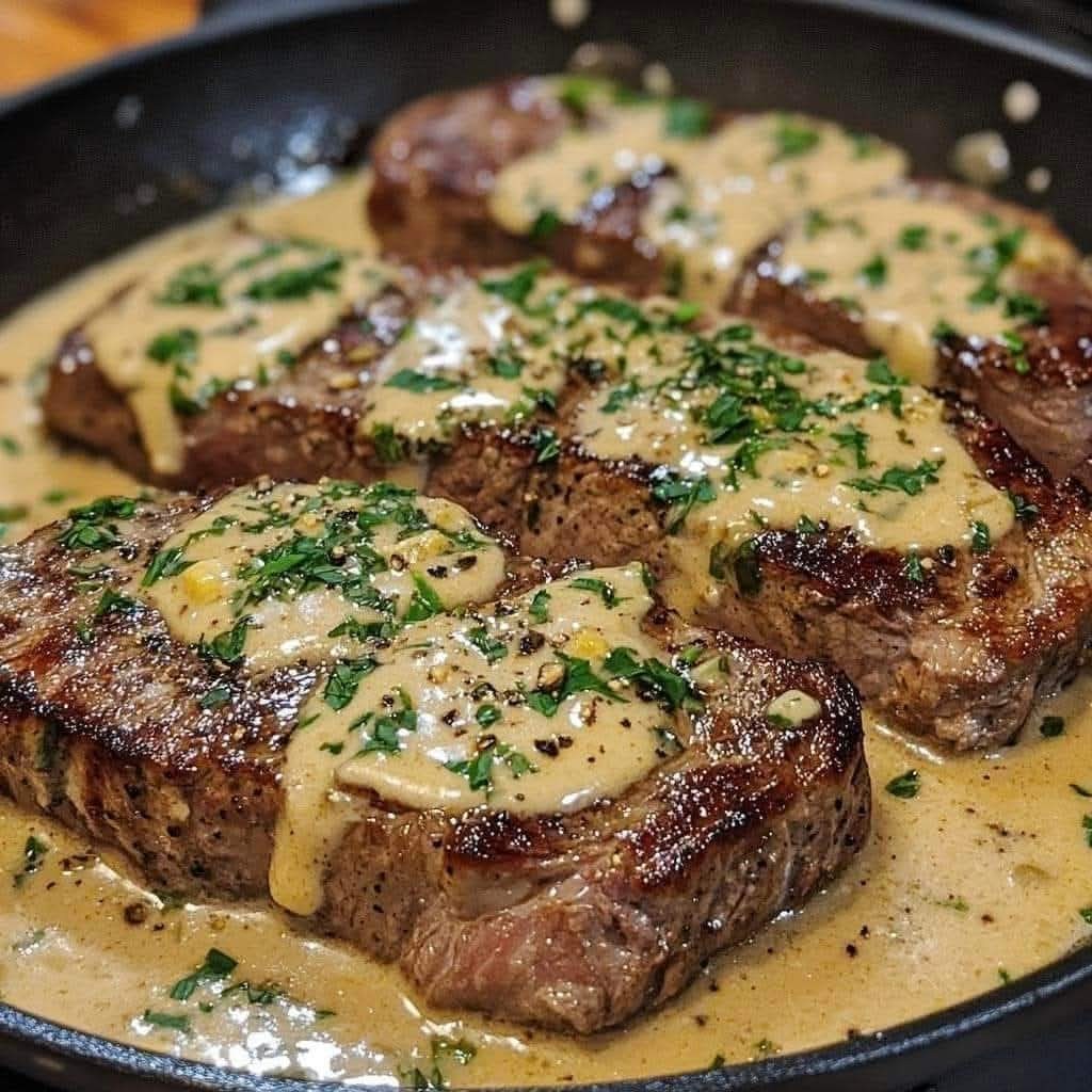 Ingredienser: Til bøffen: 3 filetbøffer (eller din smag) Salt og peber efter smag 2 spsk olivenolie 1 spsk smør Til hvidløgsflødesaucen: 1 spsk smør 4 fed hvidløg, hakket 1 kop cremefraiche 1⁄2 kop oksebouillon 1 spsk Dijon-sennep 1⁄4 kop revet parmesanost Salt og peber efter smag Frisk salsa, hakket (til pynt) Instruktioner: