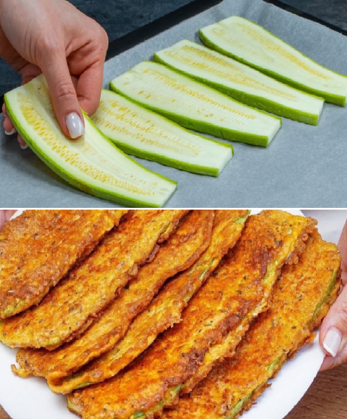 Ingredienser: 2 store zucchini Salt Sort peber 3 æg 100 g ost Italienske krydderurter Rød peber 100 g rasp 50 g mel Olivenolie 3 syltede agurker 3 spsk græsk yoghurt eller cremefraiche 2 fed hvidløg Instruktioner: