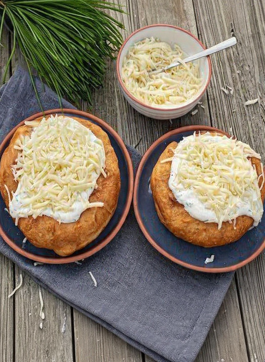 Ingredienser 📋: 🌾 500 g hvedemel 🥄 1 tsk salt 🥄 1 spiseskefuld sukker 🥄 25 g frisk gær 🥛 250 ml mælk 💧 100 ml vand 🌄 Olie til stegning 🧄 2 fed hvidløg, presset 🧀 200 g revet gul ost 🥛 200 ml cremefraiche