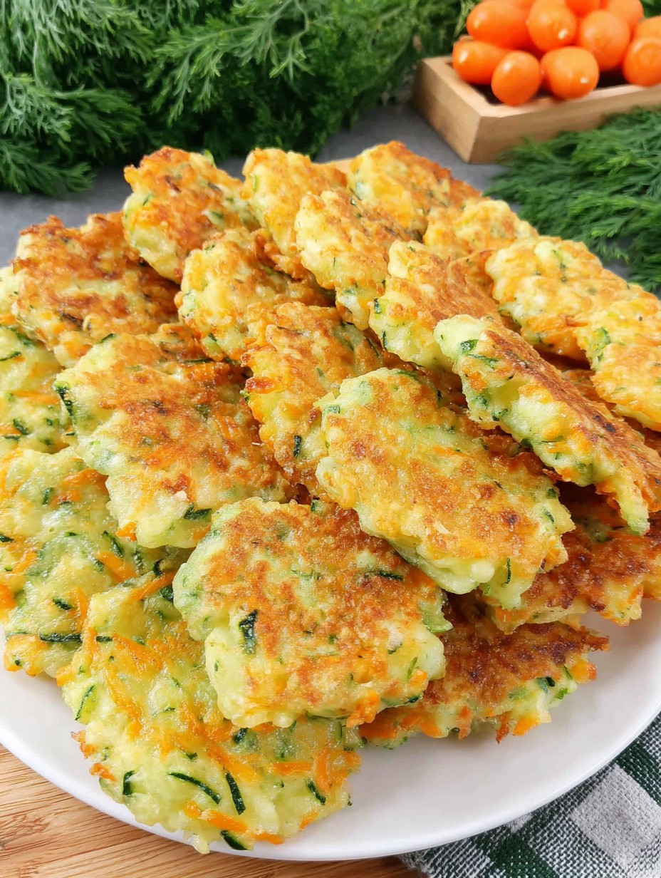 Ingredienser (til ca. 10-12 stykker): ✅ 1 stor zucchini ✅ 1 gulerod ✅ 2 æg ✅ 3 spsk. hvedemel (eller kartoffelmel) ✅ 100 g revet ost (f.eks. mozzarella, Gouda) ✅ 1 fed hvidløg (presset) ✅ 1 spsk. hakket persille ✅ salt og peber efter smag ✅ olie til stegning