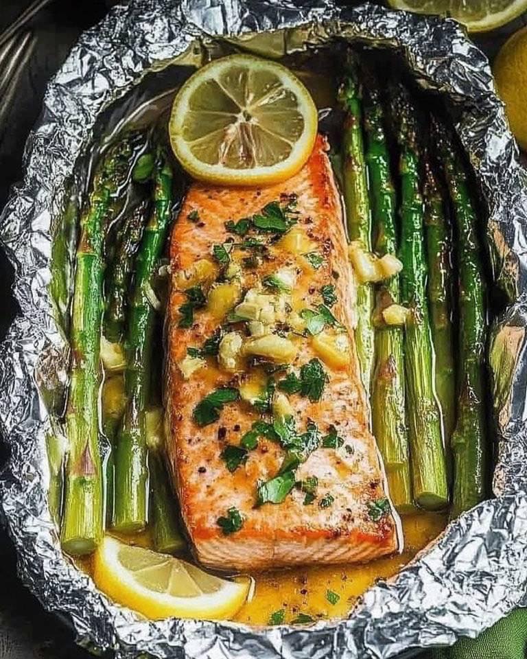 Ovnbagt laks i folie med asparges og citron-hvidløgssmørsauce er en nem, sund og smagfuld ret, der kombinerer mør laks, frisk asparges og en pikant citron-hvidløgssmørsauce. Foliepakkemetoden låser fugtigheden inde, hvilket gør laksen saftig og sprød, samtidig med at grøntsagerne får de aromatiske smagsnuancer af hvidløg og citron. Denne ret er perfekt til en hurtig hverdagsmiddag eller et særligt weekendmåltid, der føles fancy, men kræver minimal indsats.
