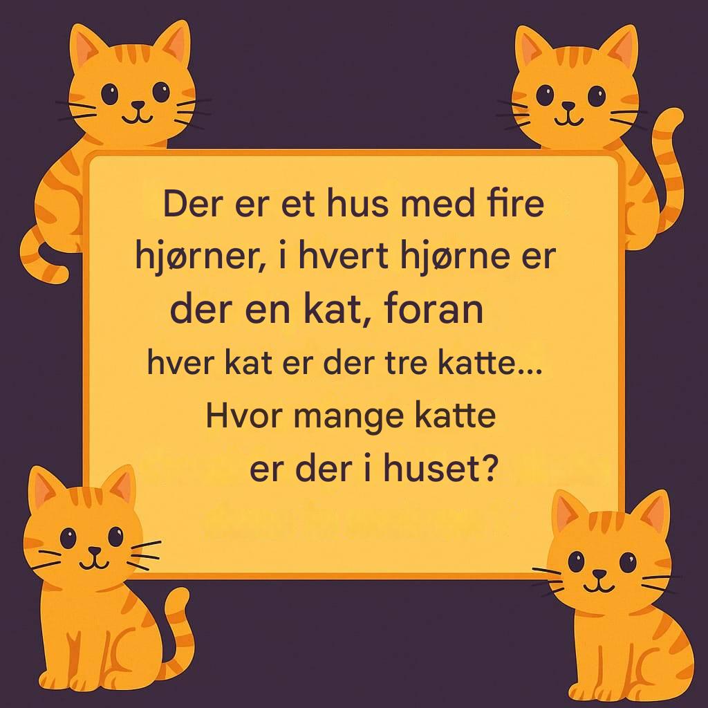 En gåde for de intelligenteGåde:Der er et hus med fire hjørner, i hvert hjørne er der en kat, foran hver kat er der tre katte … Hvor mange katte er der i huset?Svar:Der er kun 4 katte.Forklaring: Next→