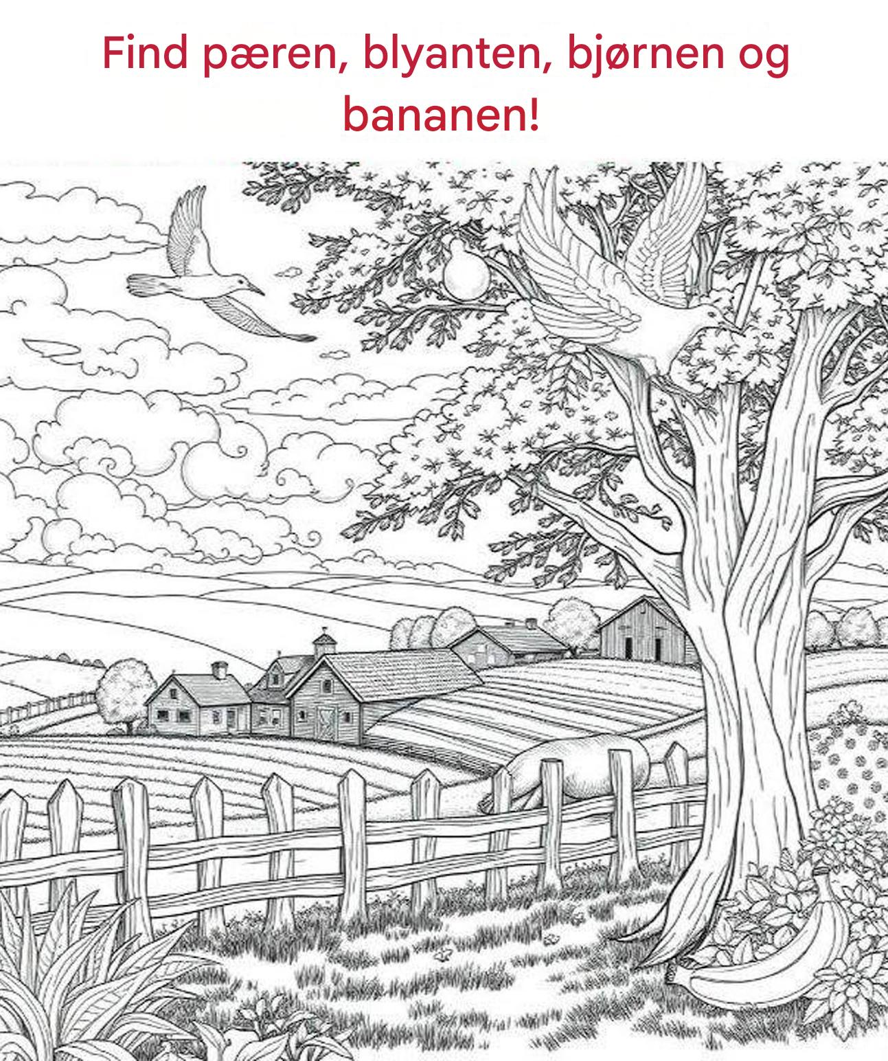 Ved første øjekast er det et rustikt, fredeligt landskab: et træhus, en rød lade, en blomsterhave og solbeskinnede frugttræer. Men bag dette fredfyldte landskab gemmer sig en udfordring: kan du få øje på pæren, blyanten, bjørnen og bananen, der er gemt i landskabet?