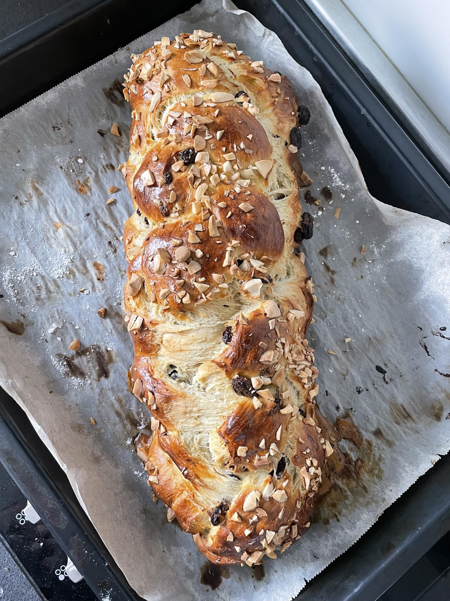 Et blødt og gyldent flettet brød med en sød smag, nødder og rosiner – smukt og velsmagende.