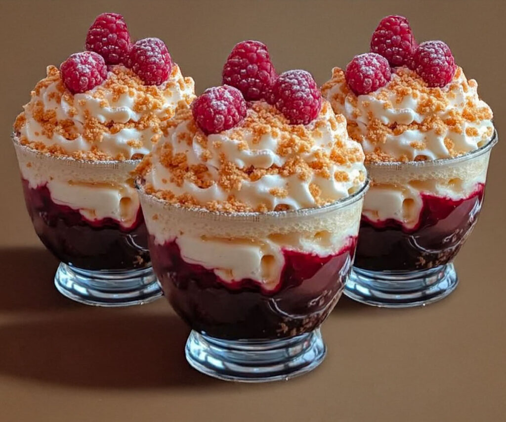 Denne dessert er den perfekte blanding af enkelhed og raffinement. Hver skefuld afslører en eksplosion af teksturer: en let krydret frugtbund, blød vaniljecreme, letheden af flødeskum og sprødheden af shortbread-kiks. Det er en dessert, der vil appellere til både voksne og børn, og takket være frisk eller frossen frugt kan den tilpasses enhver tid på året.