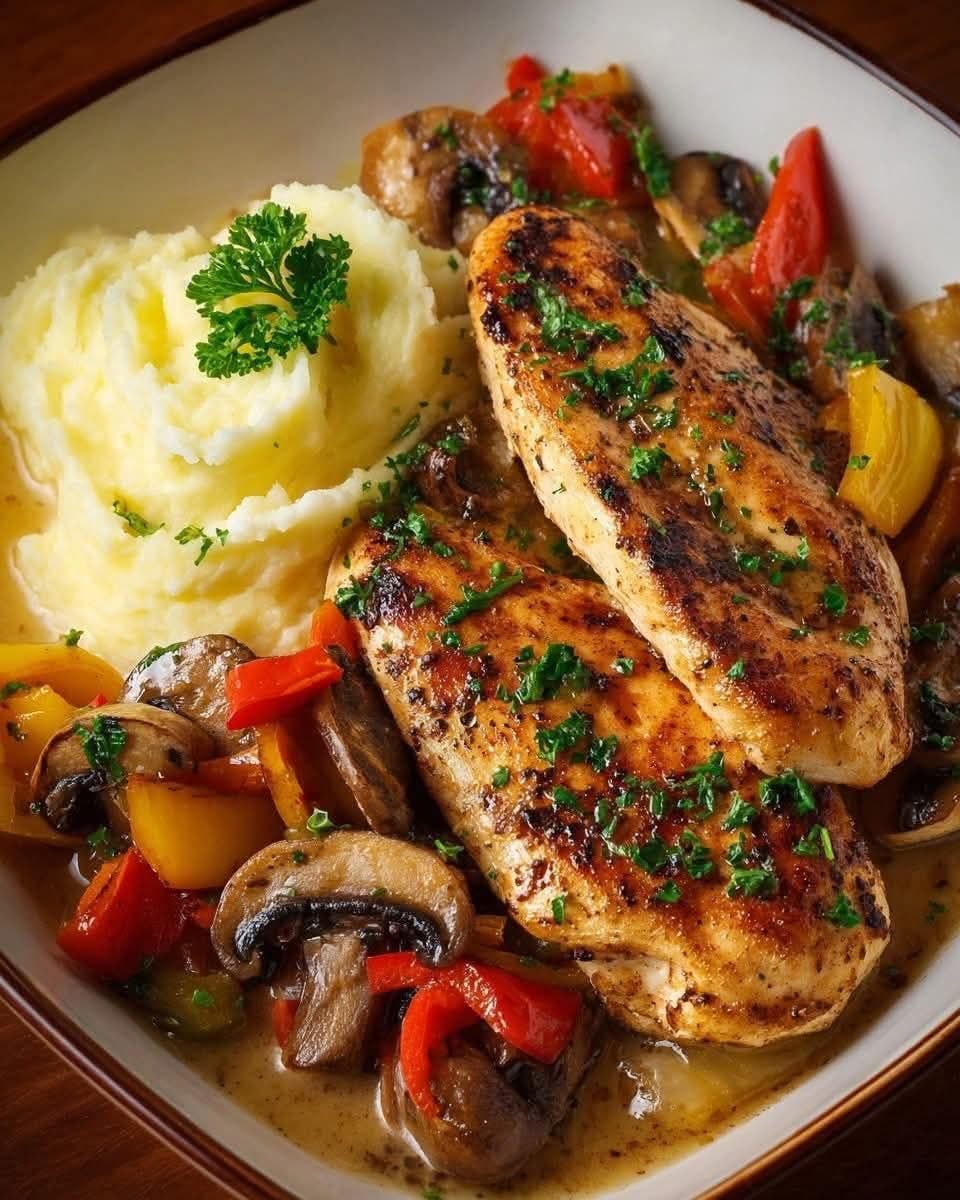 Grillet kylling med krydderurter, ristede peberfrugter, svampe og cremet kartoffelmos