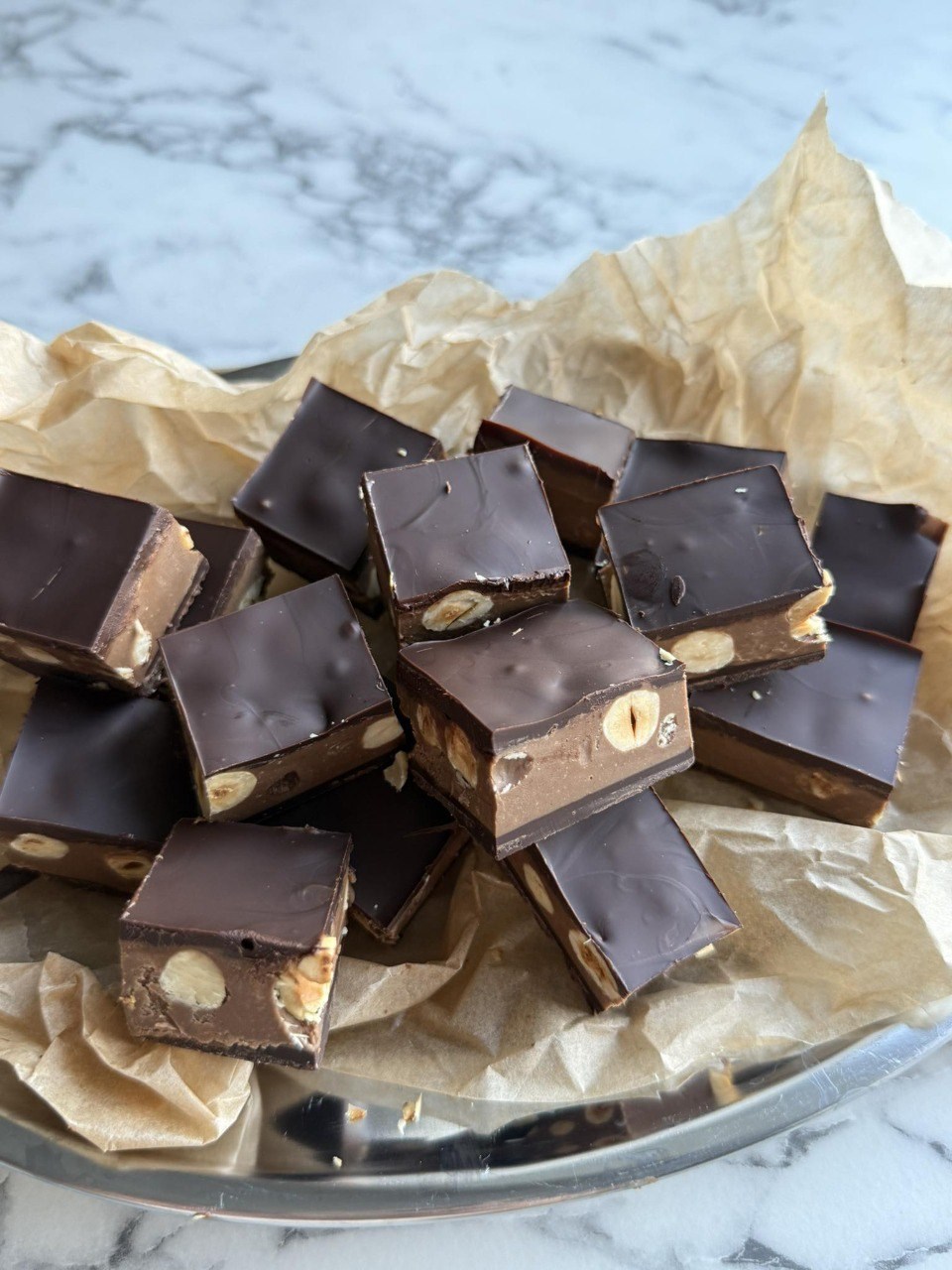Hjemmelavet Ragusa – Opskrift på hjemmelavet Ragusa chokoladebar med kun 3 ingredienser. Ragusa er altid er et hit herhjemme i julen og det er så nemt at lave den lækre konfekt selv. Ragusa er en chokoladebar med et chokoladelag i bunden, smeltet nougat og hasselnødder i midten, og så endnu et chokoladelag ovenpå.