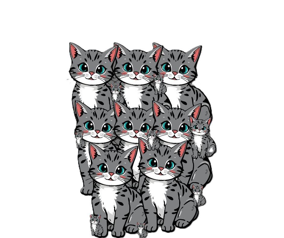 Se nøje på billedet. Hvor mange katte ser du i alt? (Nogle er store, andre meget små og gemmer sig mellem eller foran de store.)