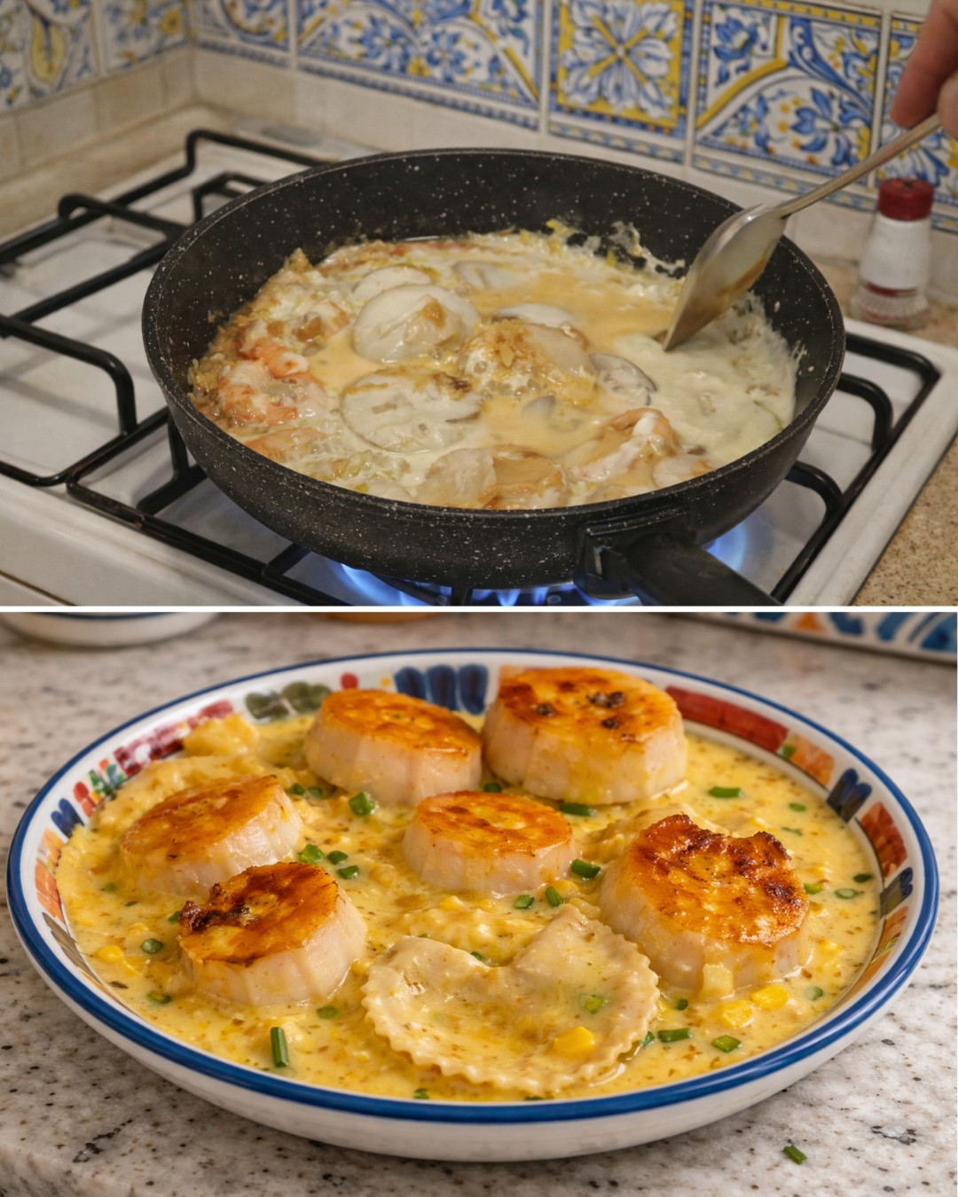 • Tilbered aldrig kammuslinger i saucen.