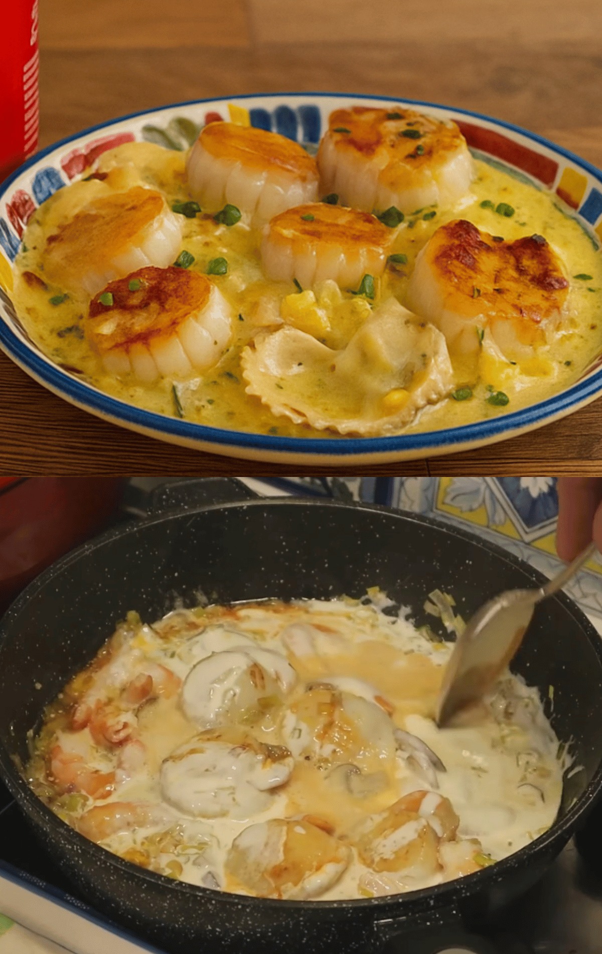 Kammuslingerne er forstærket af en blød hvidvins- og crème fraîche-sauce.