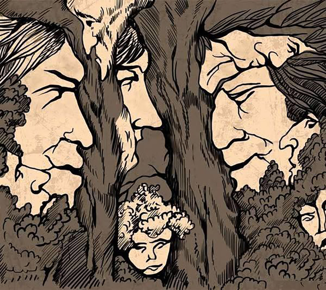Første gang jeg så denne illustration, troede jeg, at det bare var et simpelt landskab: et par træer, en lys baggrund, intet særligt. Og så, efter et par sekunder, ændrede en detalje alt. En grenkurve dannede en pande, en skygge tog form af et øje, så en anden … og pludselig var det umuligt at ignorere disse skjulte ansigter. Som om skoven selv var begyndt at holde øje med mig.