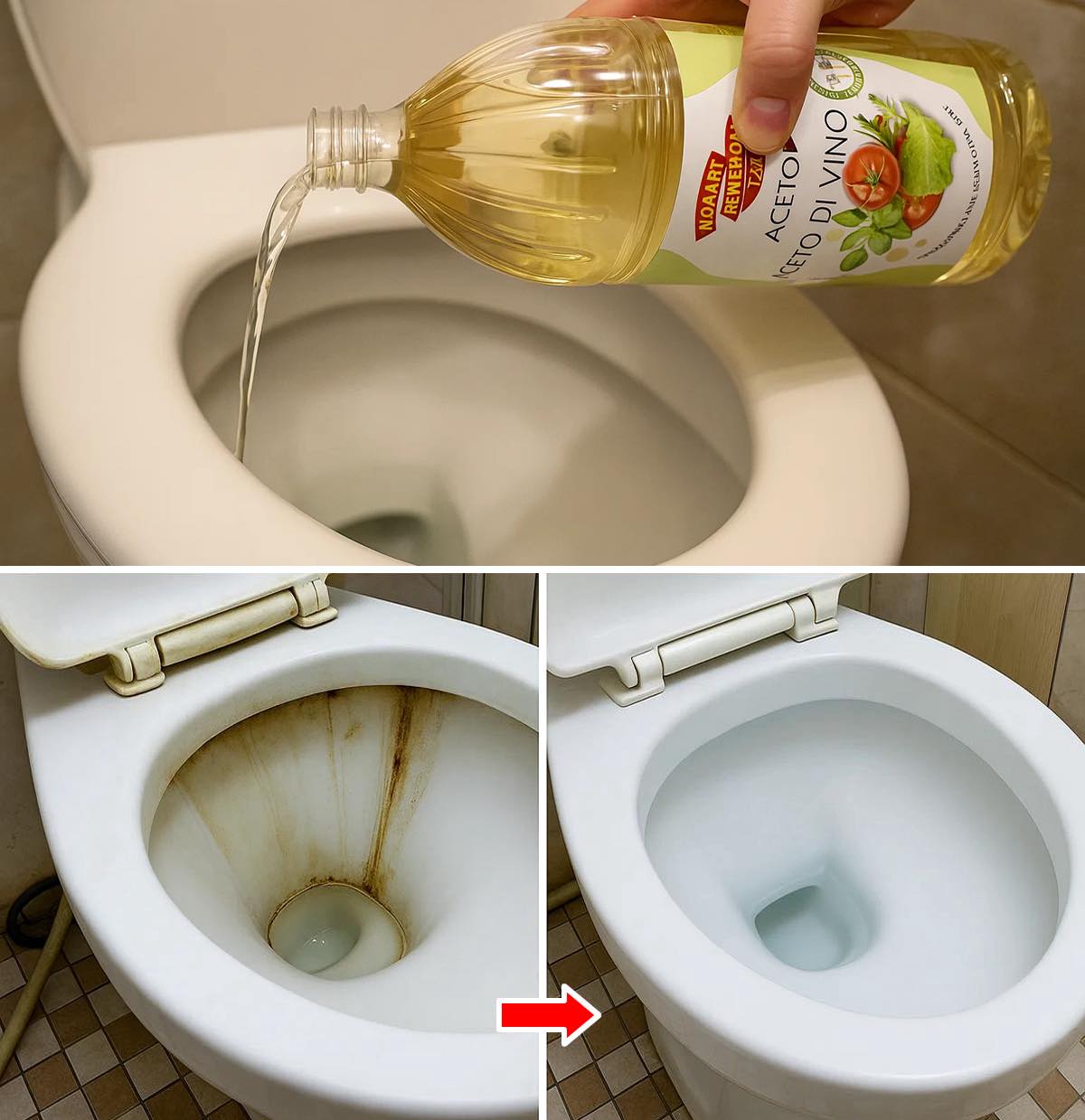 Forberedelse: Hæld 250 ml hvid eddike direkte på toilettets overflade. Sørg for at dække alle indtørrede pletter og kalk.