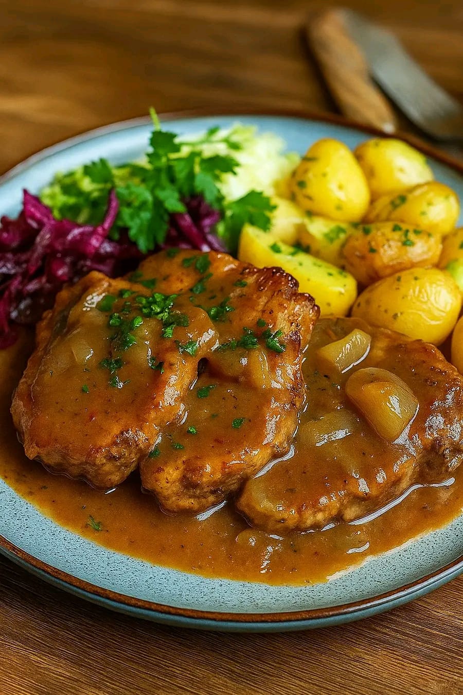 Dette er en traditionel ret med saftige svinekoteletter i en aromatisk sauce lavet af løg, krydderier og bouillon.