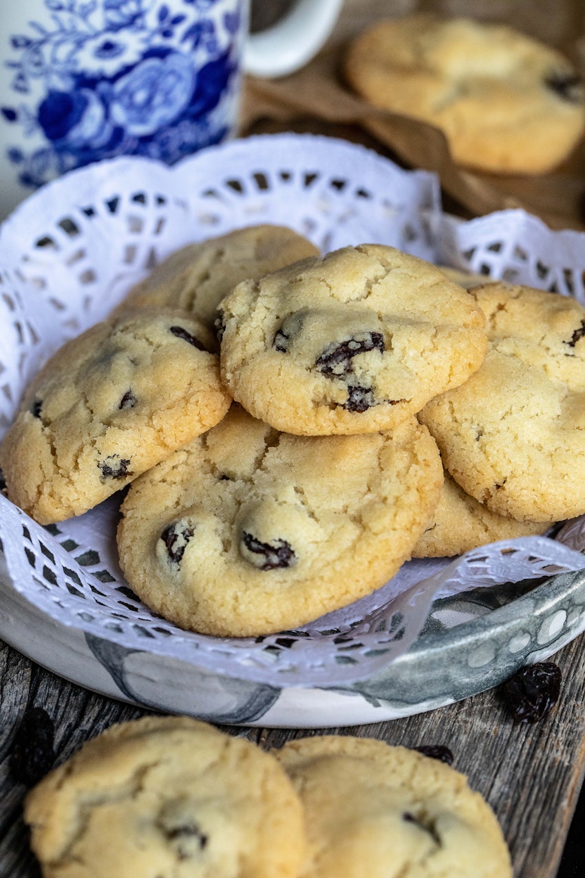 Forvarm ovnen til 175 grader. Bland smør og sukker sammen. Bland rosiner, mel og bagepulver, og bland det i smørret til en dej. Form små kugler og læg dem på en bageplade beklædt med bagepapir. Bag midt i ovnen i cirka 15 minutter.